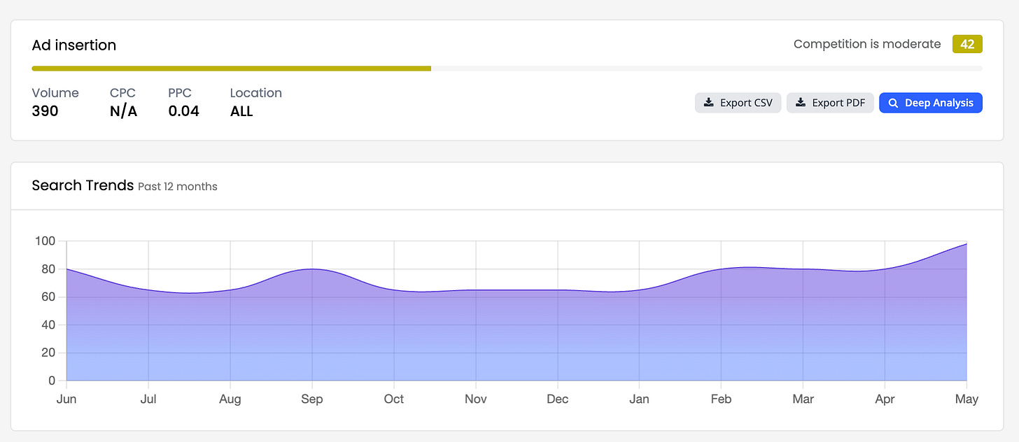 The keyword “ad insertion” gets a fairly steady 390 searches per month on Google.