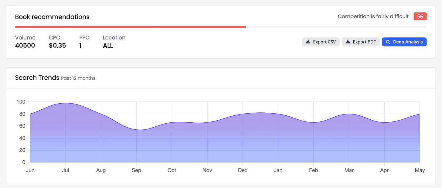 As I expected, a lot of people search for “book recommendations” on Google each month. To be exact, the monthly search volume is over 40K according to my trusty keyword research tool.