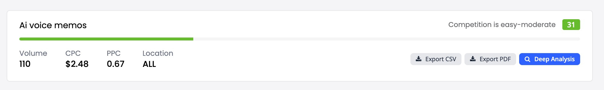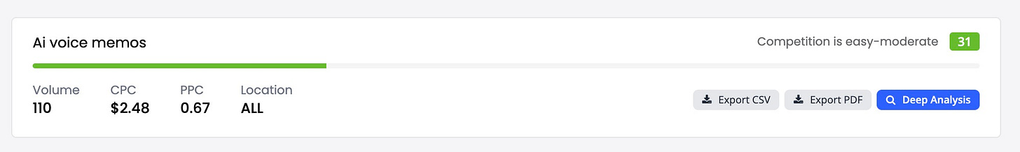 I kind of expected the keyword “utter gpt” to not have any existing monthly searches on Google and I was right. However, I searched for “ai voice memos” and that gets about 110 searches per month and is relatively easy to rank for.